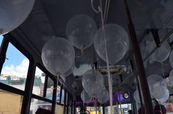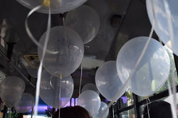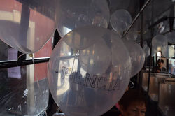 Instalación sobre un camión público urbano a partir del prefijo "Trans", en él relacioné este no-lugar con los conceptos relativos a lo transitorio. Utilicé los globos como referente a la temporalidad y en el fondo del camión coloqué el prefijo en letras grandes mientras que en cada globo los sufijos distintos que completaban las palabras referentes. Dentro de cada globo coloqué un pequeño papelito con información, dibujos o frases relacionadas a la palabra marcada en su exterior.